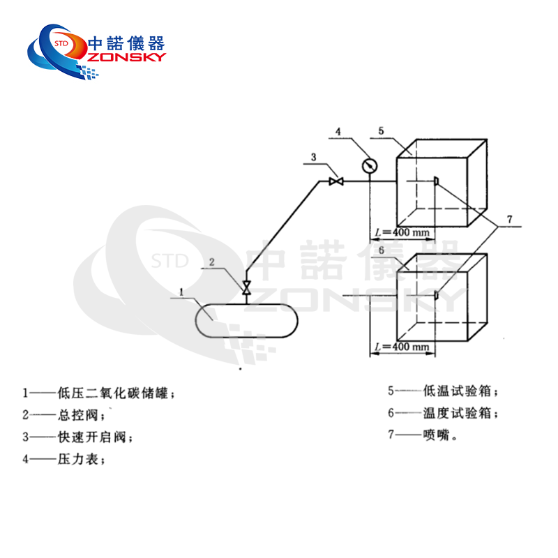 3.1儀器組成:由空氣源或液態二氧化碳瓶、試驗裝置、高溫試驗箱、低溫試驗箱組成;